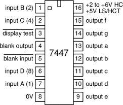 Kalau yang untuk common catoda maka logikanya tinggal dibalik saja yang tadinya "0" jadi "1" dan yang tadinya "1" jadi "0". Kelemahan menggunakan data data seperti diatas adalah terlalu banyak menggunakan pin yang dibutuhkan ( 8 buah kalo pake dot point jadi 9 buah). Untungnya toko elektronik udah ada yang juah IC untuk driver seven segmen, yaitu: IC 7447 yang memiliki konfigurasi pin input/outputnya sebagai berikut: